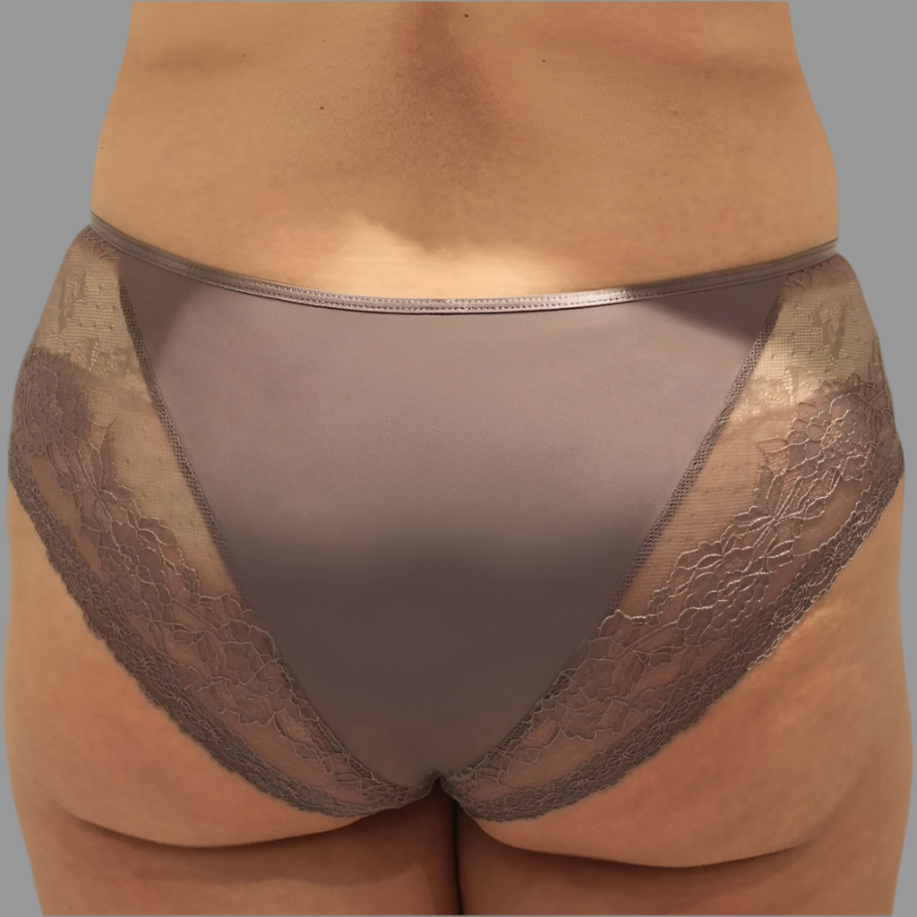 The Mia bikini style panty from FitFully Yours is on a black base with a nude lining underneath, it has beautiful lacy details on the back.